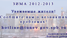 Уважаемые жители!Если Вы видите, что дома и улицы Вашего микрорайона можно и нужноочистить от снега и наледи, сообщите об этом на горячую линию главыадминистрации Невского района Санкт-Петербурга С.А. Ситдикова поадресу: hotline@tunev.gov.spb.ru.Кроме ...